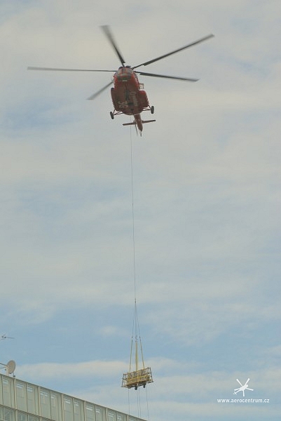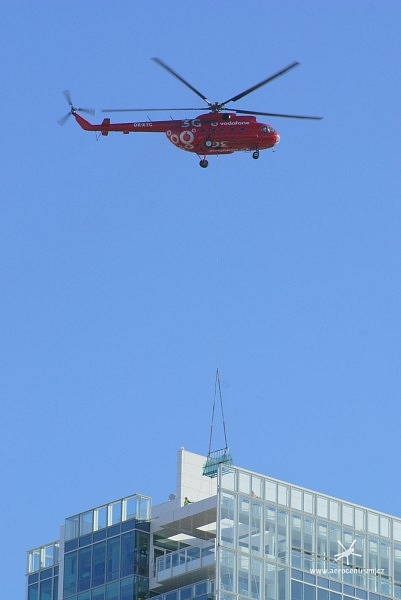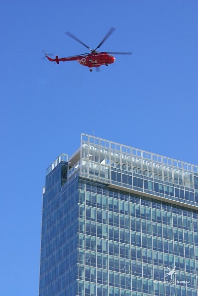 Do 27.patra nejvyšší budovy v Praze vrtulník Mi-8 spouštěl skleněné tabule a materiál pro dokončované luxusní prostory.