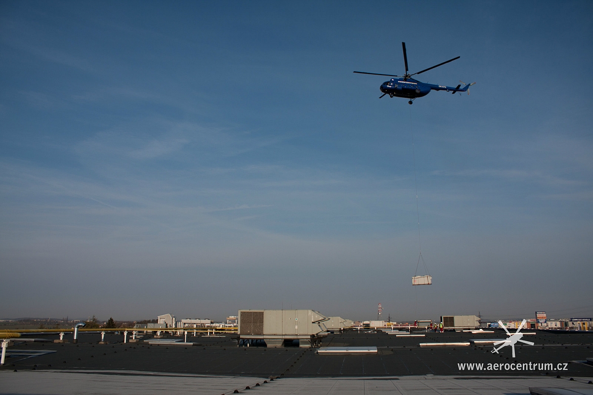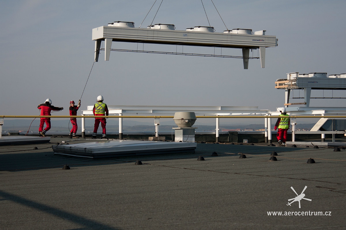 Brzy ráno byla zahájena přeprava vzduchotechnických jednotek na střeše v obchodní zóně na Pražském Zličíně. Součástí velké rfekonstrukce prodejny Tesca byla i renovace vzduchotechniky a vzhledem k špatnému přístupu k jednotkám na rozlehlé střeše byl povolán náš vrtulník. Během jedné hodiny došlo k snesení 11 jednotek o celkové hmotnosti okolo 15 tun a na nové rámy pak byly dopraveny nové chladící kondenzátory o hmotnosti 2×2 tuny.