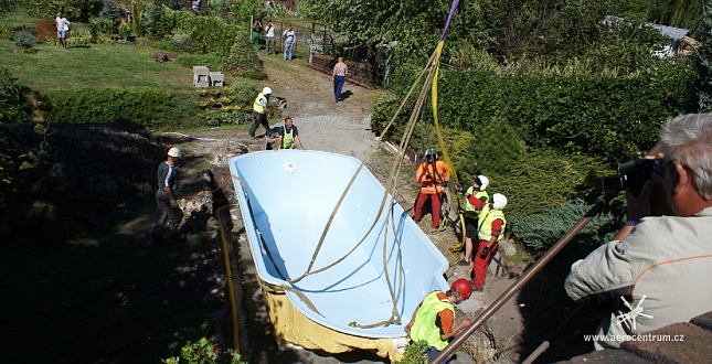 Doprava a usazení laminátového bazénu do koutu zahrady technice nepřístupné.