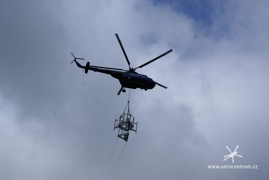 Stavba GSM věže operátora Vodafone nedaleko Slané u Semil pomocí vrtulníku.