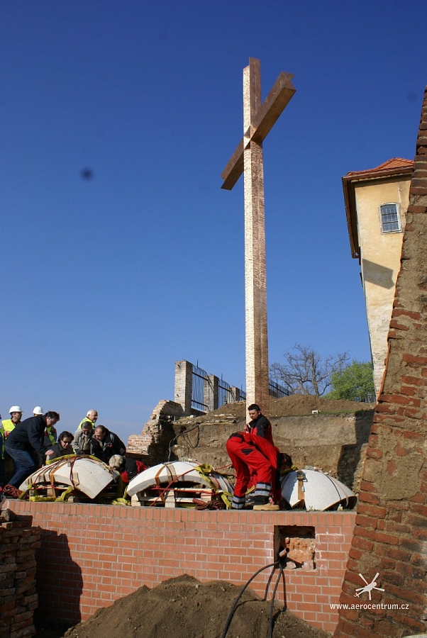 Dvanáct metrů vysoký kříž, který připomíná předloňskou návštěvu papeže Benedikta XVI., vztyčili v sobotu dopoledne v Denisových sadech v centru Brna. Jediným způsobem, jak více než tunu vážící monument na místo přepravit, bylo použít vrtulník.